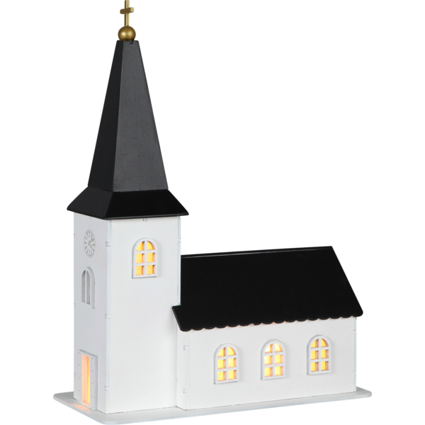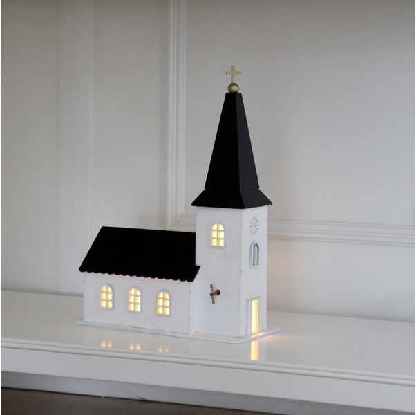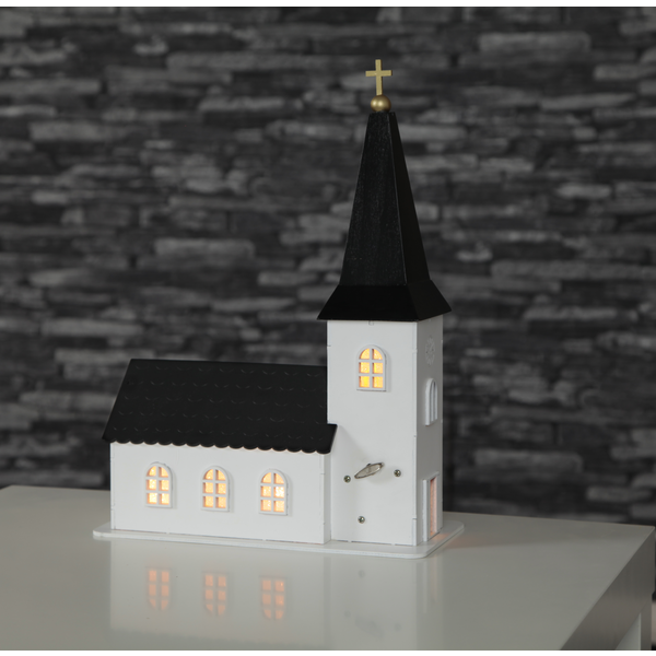 Batteridriven, vit och svart målad träkyrka där det lyser vackert i fönstren. Klassisk speldosa spelar Stilla natt. Fantastisk advent och juldekoration för den perfekta julkänslan.
