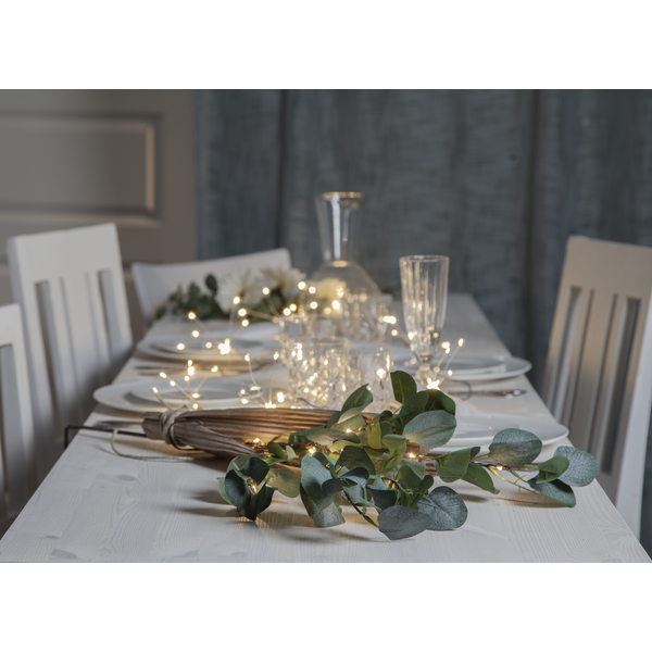 Vacker dekorationskvist med gröna eucalyptusblad, 15 varmvita ljuspunkter. Med batteridosa och timerfunktion, för inomhusbruk. Matcha gärna med girland 581-32 för en effektfull och vacker dekoration.