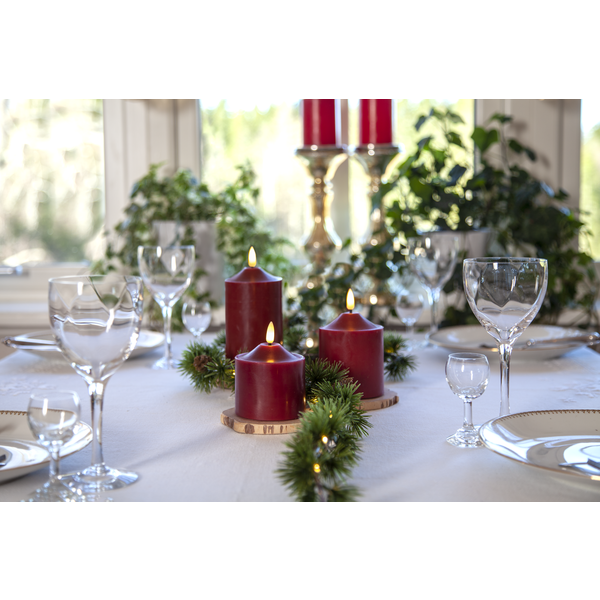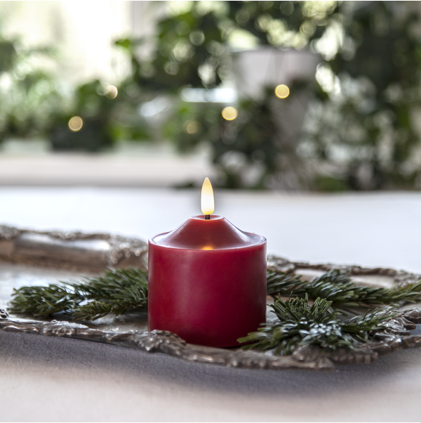Flamme top är ett vaxljus i mörkröd färg. Ljusets storlek är ca 7,5cm i diameter och höjden inklusive låga är ca 9,5cm. Detta batteriljus blir en vacker dekoration, både ensam och i grupp ihop med övriga ljus från vår Flamme serie. Det har timerfunktion och när brytaren är på timerläget lyser ljuset i ca 30 dagar med en vacker realistisk låga i varmvitt. Det drivs av 2 AA batterier, dessa ingår ej. Undvik att ställa ljusen i direkt solljus då de kan smälta och missfärgas av värmen.