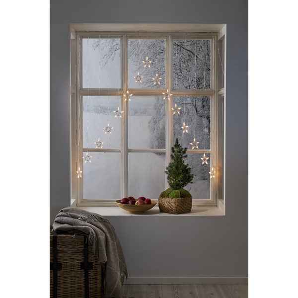 Gardin för inomhusdekoration, batteridriven med 3 st AA batterier, med timerfunktion. Vacker dekoration för fönster med en stjärna längst ner på varje kabelsträng.