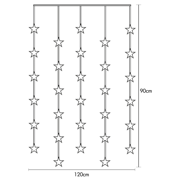Härlig ljusgardin med varmvitt sken för inomhusbruk. Placera gardinen i fönstret som en härlig dekoration med vackert ljus. Stjärngardinen har 30st LED-ljuskällor och en transparent kabel.