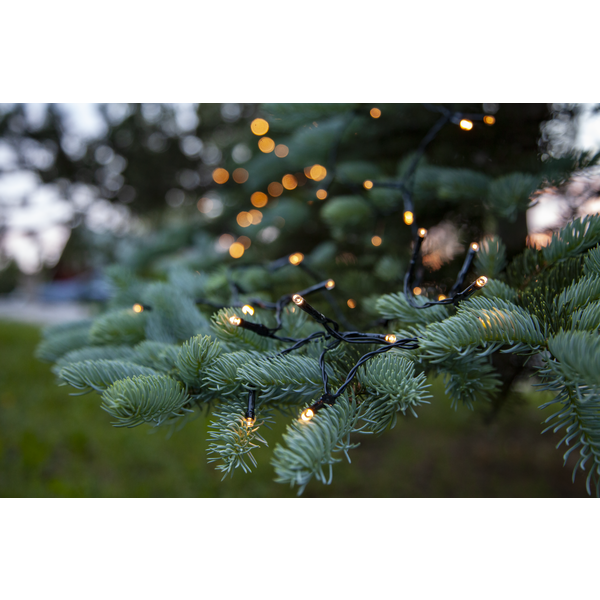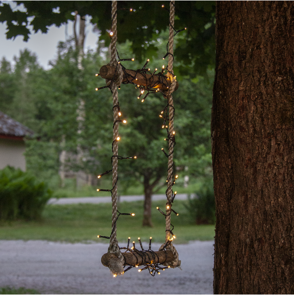 Slinga med 160 varmvita ljuspunkter med batteribox för både inom- och utomhusbruk, drivs med 3xAA batterier. För optimal livstid av batterierna har slingan repeterande timer funktion, 6 timmar på coh 18timmar av. Enkel att placera i trädgården för ett härligt sken.