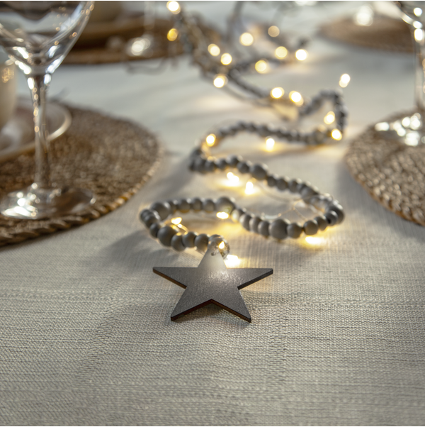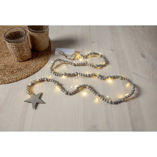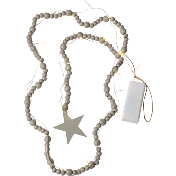 Exklusiv ljusslinga för inomhusbruk med träpärlor. Greige färg som matchar våra ljusstakar i beige. Tunn metallslinga med 30 varmvita LED virad runt pärlorna ger ett vackert sken, passar till bordsdekoration och julgransdekoration. Batteribox med timerfunktion.