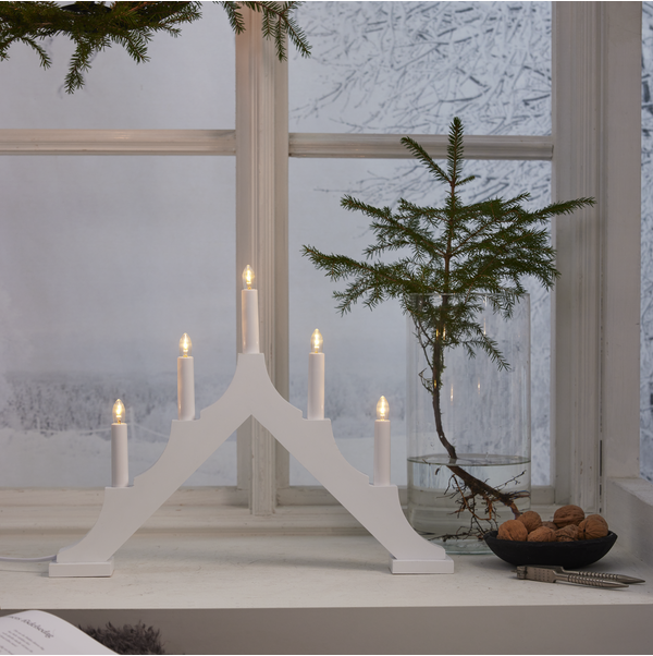 Vit adventsljusstake tillverkad i trä. Klassiskt formad ljusstake med modern touch. Fin ljusbild som skapar den perfekta julstämningen i ditt fönster. Denna produkt har FSC®-märkning.