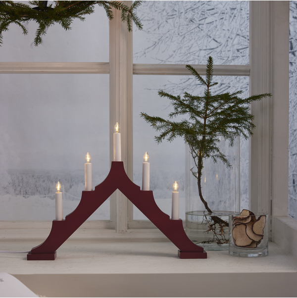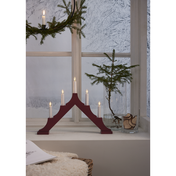 Röd adventsljusstake tillverkad i trä. Klassiskt formad ljusstake med modern touch. Fin ljusbild som skapar den perfekta julstämningen i ditt fönster. Denna produkt har FSC®-märkning.