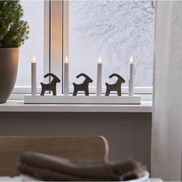 Design Charlotte Falck.Klassisk adventsljusstake som ger ett modernt intryck. Julbockar och bas i trä tillsammans med metallpipor. Lyser fint med fyra LED lampor. Skapar fin julkänsla och härlig stämning. En självklar ljusstake i hemmet från år till år. Förhöj ljusstaken genom att använda vår ljusstake för LED-candle i samma serie.