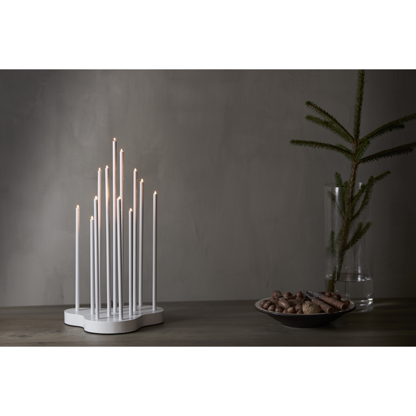 Stilren ljusstake med kraftig träbas, ljuspipor av tunna metallrör. 12st ljuskällor, E5 lampor. Hela ljusstaken i vit färg. Textilkabel i vitt/grå. Ger ett härligt stämmnigsfullt ljus hela året runt.