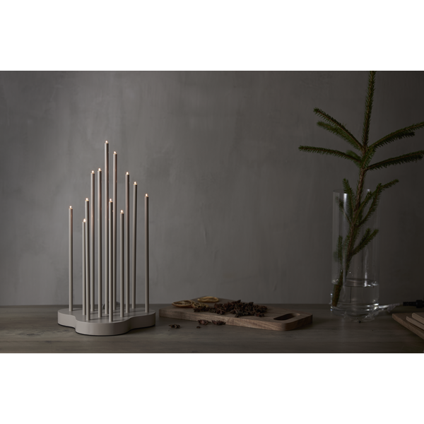 Stilren ljusstake med kraftig träbas, ljuspipor av tunna metallrör. 12st ljuskällor, E5 lampor. Hela ljusstaken i elephant (beige). Textilkabel i vitt/grå. Ger ett härligt stämmnigsfullt ljus hela året runt.