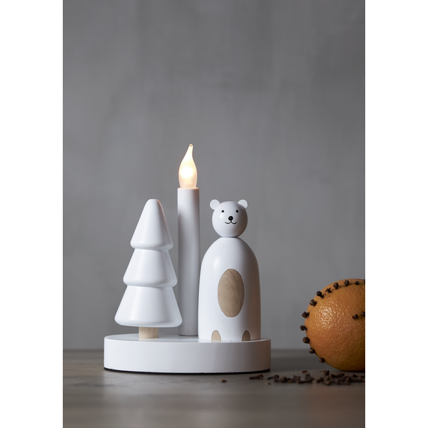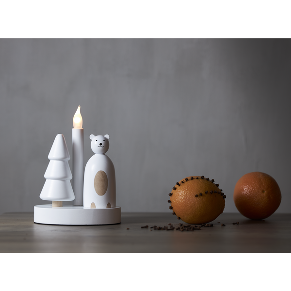 Julens härligaste dekoration i form av en svarvad isbjörn och gran med 1 ljus. Liten adventsljusstake tillverkad i trä. Led lampa ingår. Placera den i ett fönster eller och på en skänk. Härlig adventljusstake att dekorera med till jul.