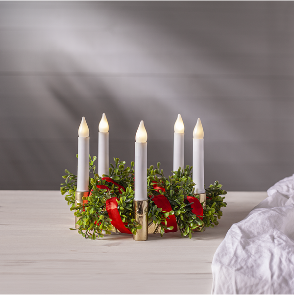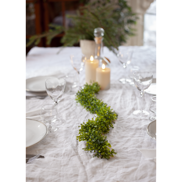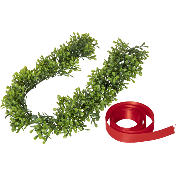 Dekorativ girlang av konstgjort grönt lingonris. Perfekt att dekorera luciakronan med, det medföljer även ett 2 m långt rött band. Girlangen är 70cm lång. Kan även användas att dekorera med på bordet eller kransar.