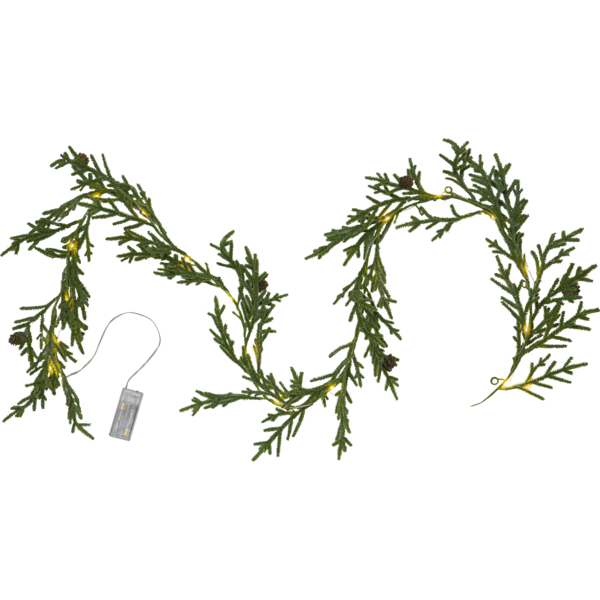 Girlang i PE material med lite glitter och små kottar. Lyser upp med 20 varmvita dewdrops.
