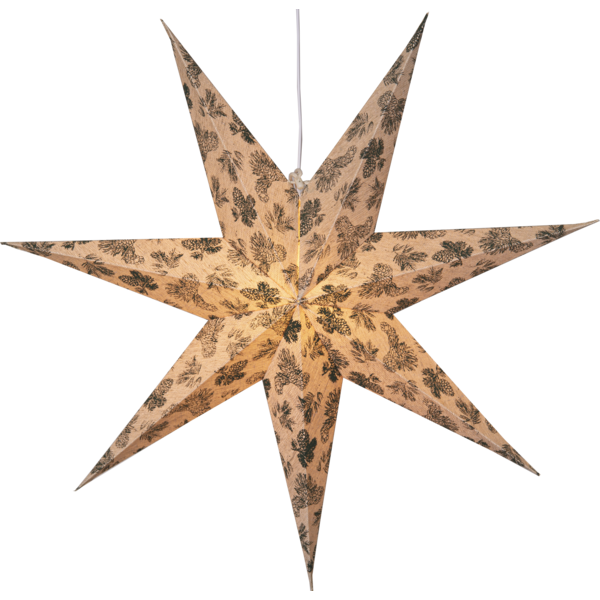 Pappersstjärna med FSC®-märkning. Den klassisk adventsstjärna har ett fint vintrigt mönster i grönt med kottar och granbarr. Dekorera till advent och den ger en härlig julstämning. Köp till sladdställ och ljuskälla för att få ljus i stjärnan