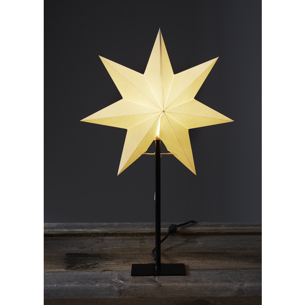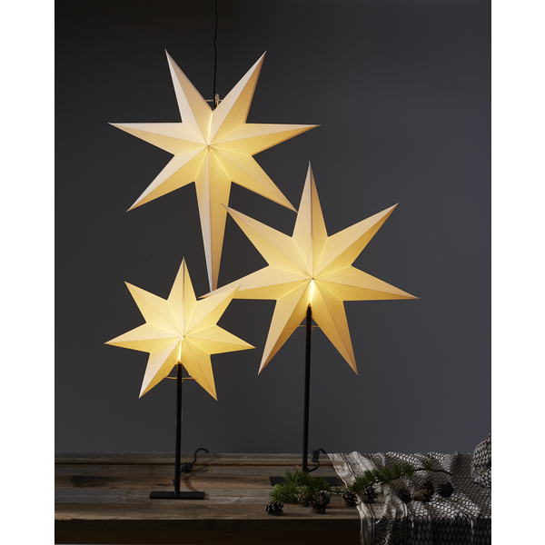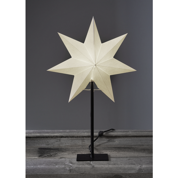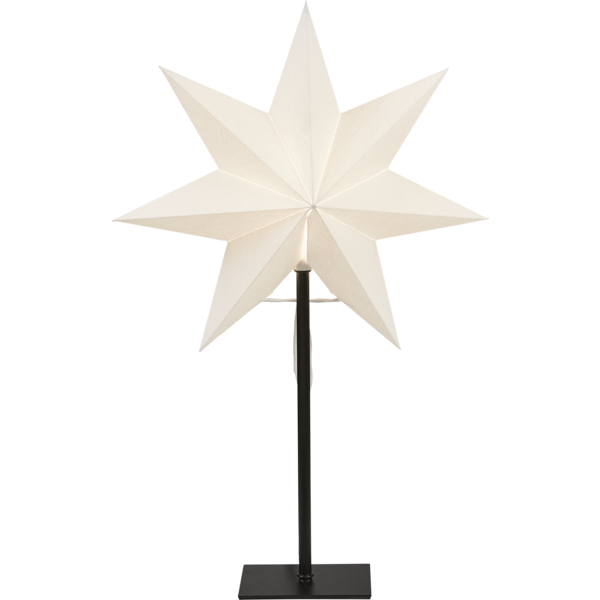 Vit stjärna på fot med svart textilkabel. Elegant stjärna att dekorera med i hemmet. Stjärnan har plats för en ljuskälla. Höjden är 55cm.