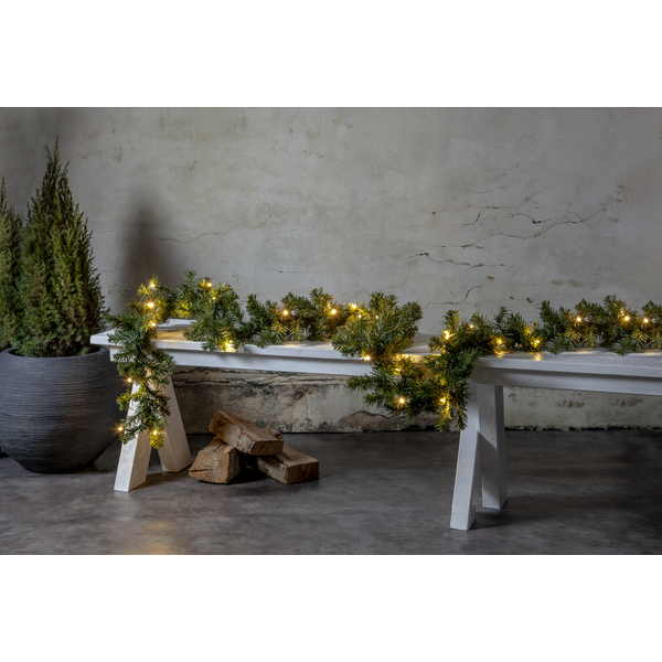 Grön girland med 60 LED-lampor. En dekorativ girland som avger ett varmvitt sken. Användningsområdet är inomhus eller utomhus.