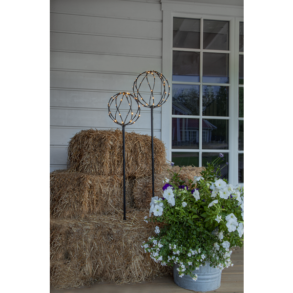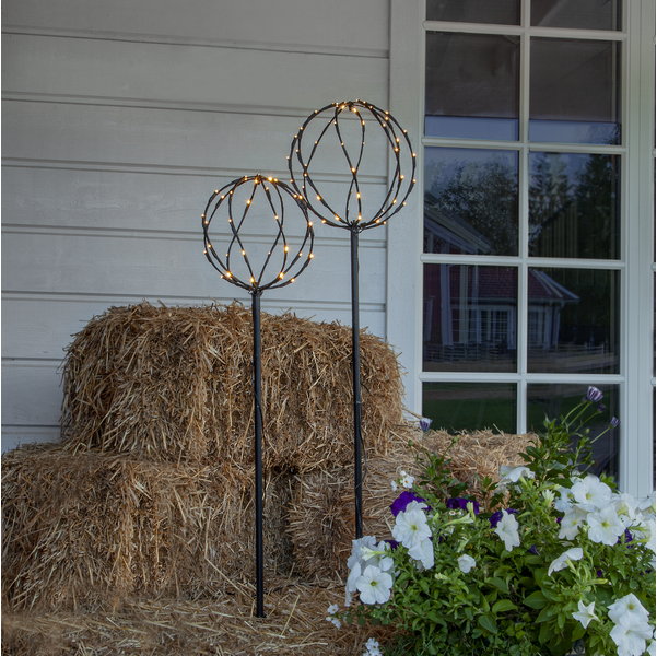 Dekorativ utomhusbelysning i set av 2 svarta runda klot med tillsammans 96 varmvita ljuspunkter. 2,5 m kabel mellan kloten gör produkten lättplacerad i din trädgård, på altanen eller balkongen. Höjden på kloten är 130cm och 110cm med en diameter på 28cm respektive 23cm. Med transformator som är IP44 klassad.