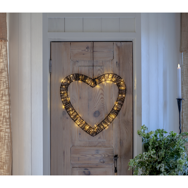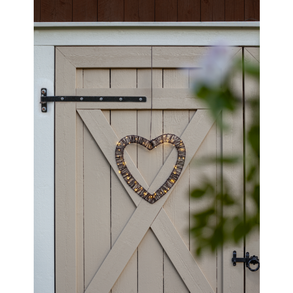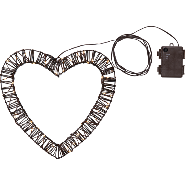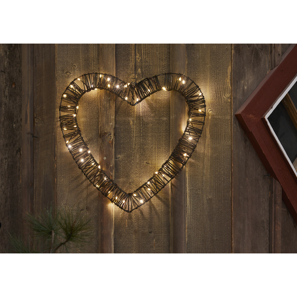 Hjärta i metallstomme med brun konstrotting, 50 varmvita LED och batteridosa för utomhusbruk med timerfunktion. Snygg att placera på vägg eller dörr.