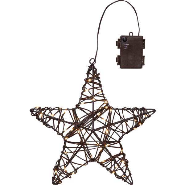 Batteridriven 30 cm stjärna i metallram med brun konstrotting, 50 st varmvita lysdioder och timerfunktion. Dekorera din trädgård eller hem. Passar både inom- och utomhus.