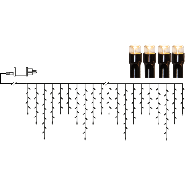 Istappsslinga med 960 LEDljuspunkter med vackert varmvitt ljussken. Slingan är ca 24 meter lång med istappar i tre längder, 15, 35 och 55 cm. Perfekt för dekoration i din trädgård eller på huset. Shiny Warm White är en prisvärd basserie. Till denna slinga ingår transformator för utomhusbruk.