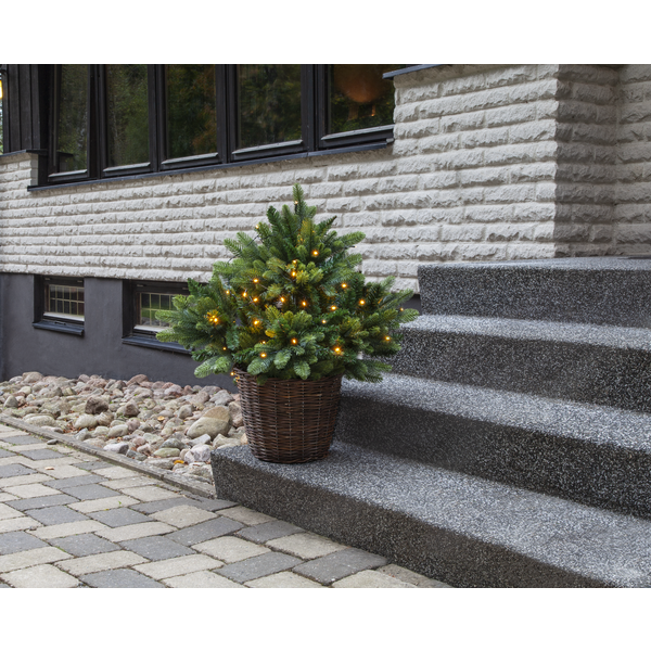 Vacker buske som går att placera utomhus i marken eller inomhus i en kruka. Fot ingår ej. Slinga med 40 varmvita LED lyser upp busken, denna slinga får sättas på av användaren. Drivs med 3xAA batterier (ingår ej) och har inbyggd timer.