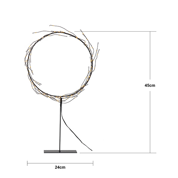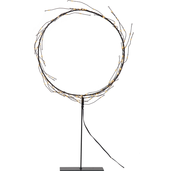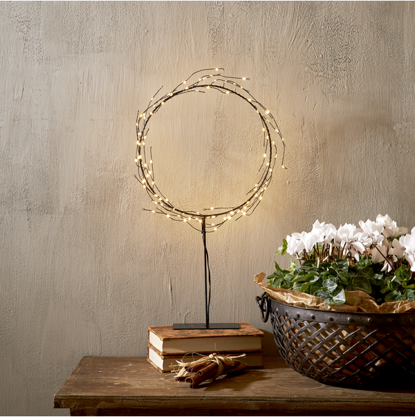 Stämningsfull krans på fot i svartmålad metall, 95 små led punkter lyser fint i kransen. Dekorerar till jul och advent eller varför inte så fort den mörka årstiden börjar.