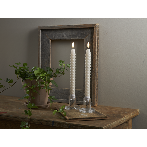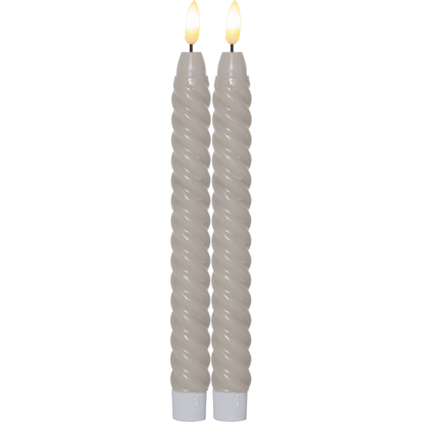 Twistat beige vaxljus i vår Flamme serie. Den naturtrogna lågan lyser med ett varmvitt sken. Med inbyggd timer. storlek på ljuset med låga 25cm. Dessa ljus har en silikonbelagd fot som gör att ljusen står stadigare i ljushållaren. Undvik att ställa ljusen i direkt solljus då de kan smälta och missfärgas av värmen.