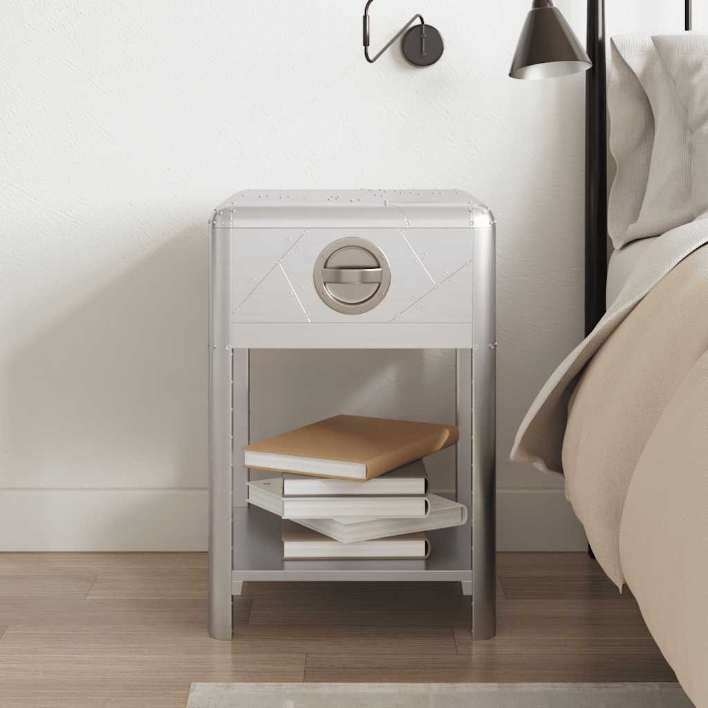 Detta sidobord är tillverkat i massivt trä och dess yta är klädd i ett lapptäcke av polerade aluminiumpaneler och accentuerad med synliga skruvar, som gör den extremt hållbar. Dess mjuka kanter och retrohandtag ger den ett unikt utseende.