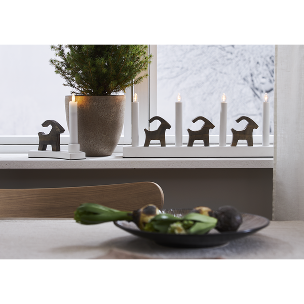 Klassisk ljusstake som ger ett modernt intryck. Julbock och bas i trä. Används med fördel ihop med våra fina LED candle. Lyft ljusstaken lite extra och använd den gärna ihop med vår fina adventsljusstake i samma serie. Skapar fin julkänsla och härlig stämning. En självklar ljusstake i hemmet från år till år.