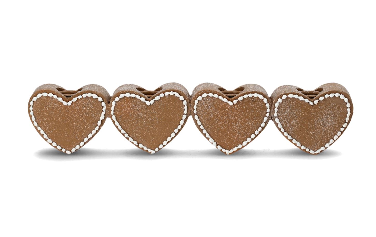 Ljusstake med pepparkakshjärtan och plats för fyra ljus. Perfekt som roligt julpynt och som adventsljusstake. Tillverkad i poly.
