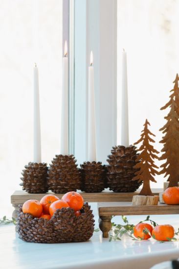Ljusstake för fyra ljus i formen av kottar. För dig som vill inspireras av skog och natur i inredningen. Tillverkad i poly