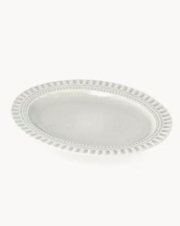 Ovalt uppläggningsfat med vacker kant. När du vill servera en middag med det lilla extra. Tillverkad i stengods. Finns i flera färger.