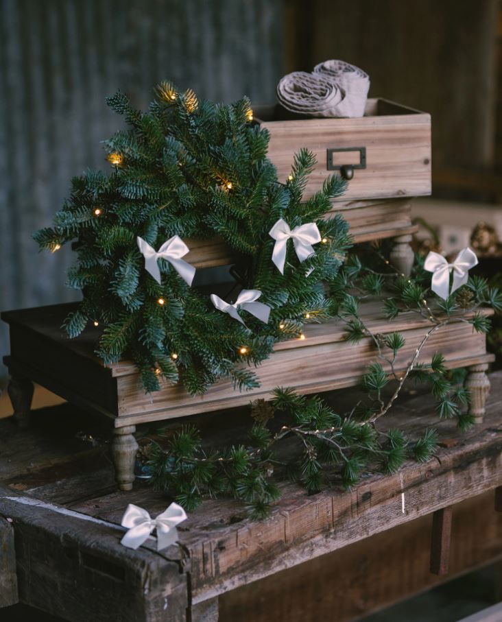Krans med konstgjorda grankvistar och LED-ljus som är fin att hänga upp som den är eller som ett jularrangemang.