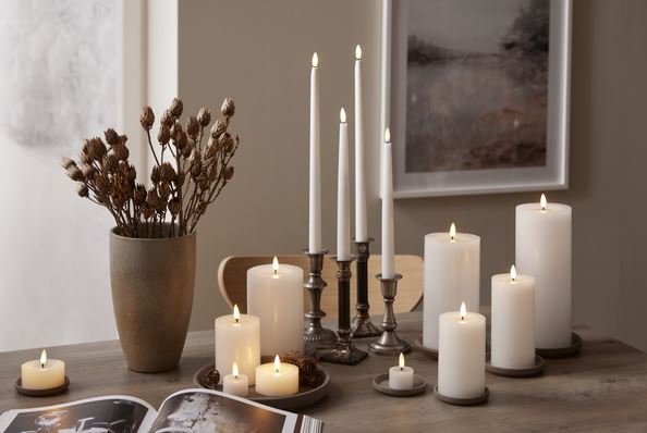 Flamme Flow är ett 2 pack batteridrivet värmeljus i en större storlek; 7x5,5cm inklusive lågan. Stearinljuset har en blank nedsänkning under lågan, denna yta ser ut som flytande vax vilket gör ljuset än mer naturtroget ihop med den naturtrogna Flamme lågan i varmvitt. Detta ledljus blir en vacker dekoration, både ensam och i grupp ihop med övriga ljus från vår Flamme serie. Den har timerfunktion och när brytaren är på timerläget lyser ljusen i ca 65 dagar, väljer man on läget så lyser ljusen i ca 400 timmar. De drivs av 2 AAA batterier, dessa ingår ej. Undvik att ställa ljusen i direkt solljus då de kan smälta och missfärgas av värmen.