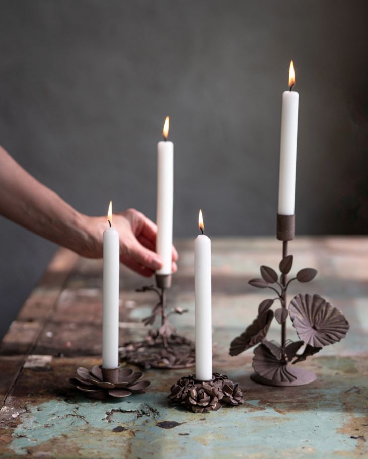 Ljusstake med blommor som blir ett fint sätt att få in levande ljus i hemmet. Tillverkad i metall.