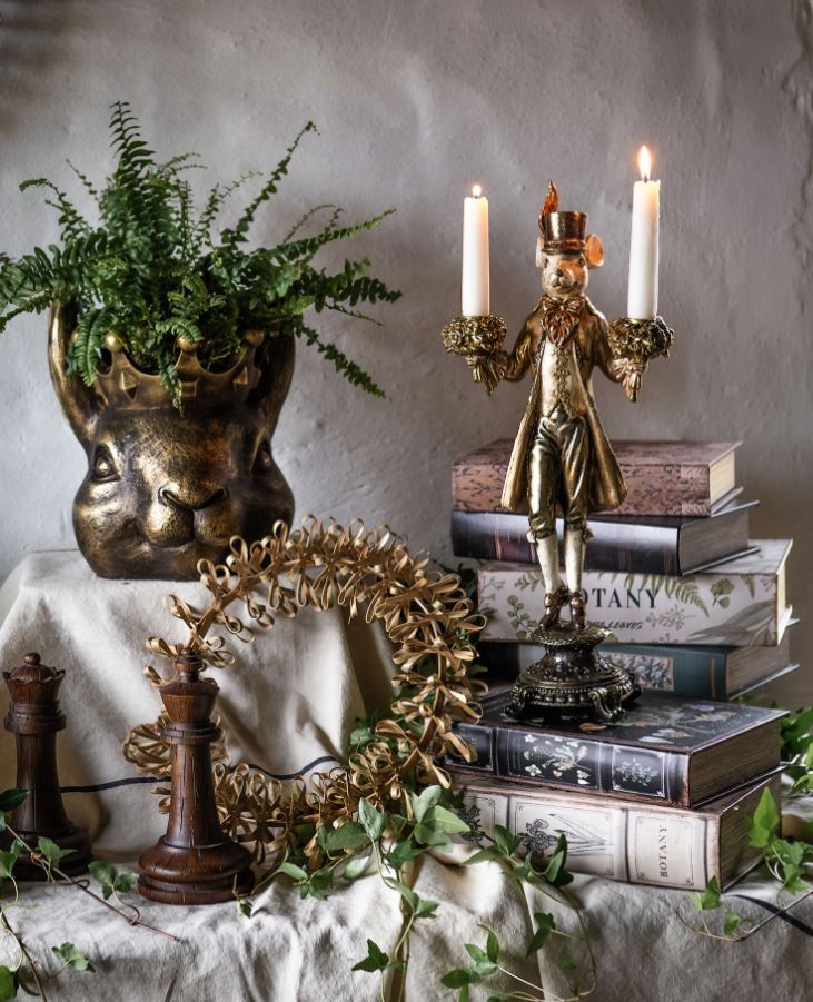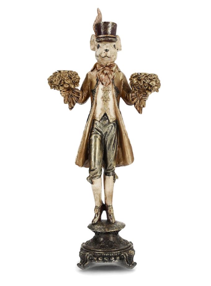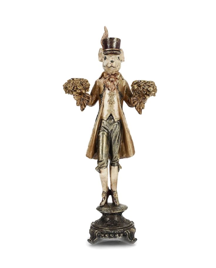 Mus med hatt och frack som håller två buketter i händerna där ljushållarna finns.