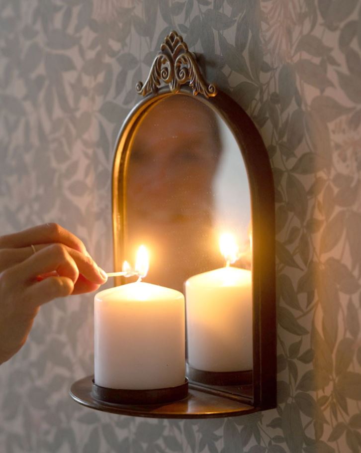 Vacker väggljusstake med spegel blir en perfekt blandning av dekoration och ljusstake och hänger vackert på väggen. Tillverkad i spegelglas och metall.
