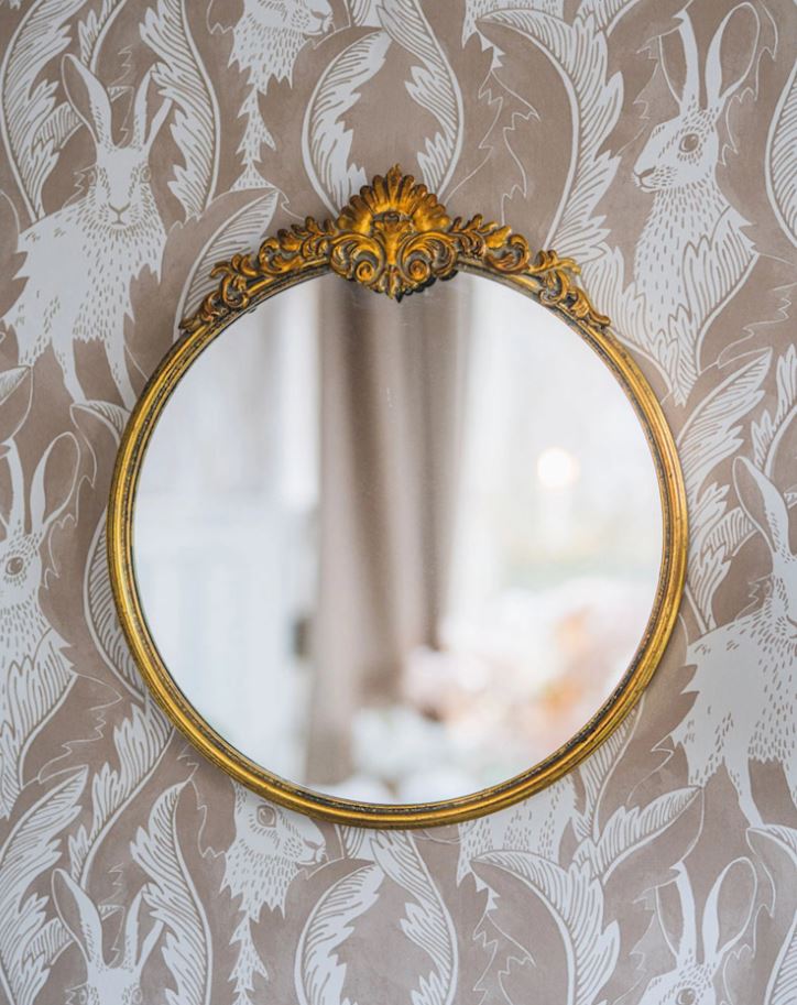 Vackert ornamenterad rund spegel som hänger fint på väggen i hallen eller i sovrummet. Tillverkad i metall och spegelglas.
